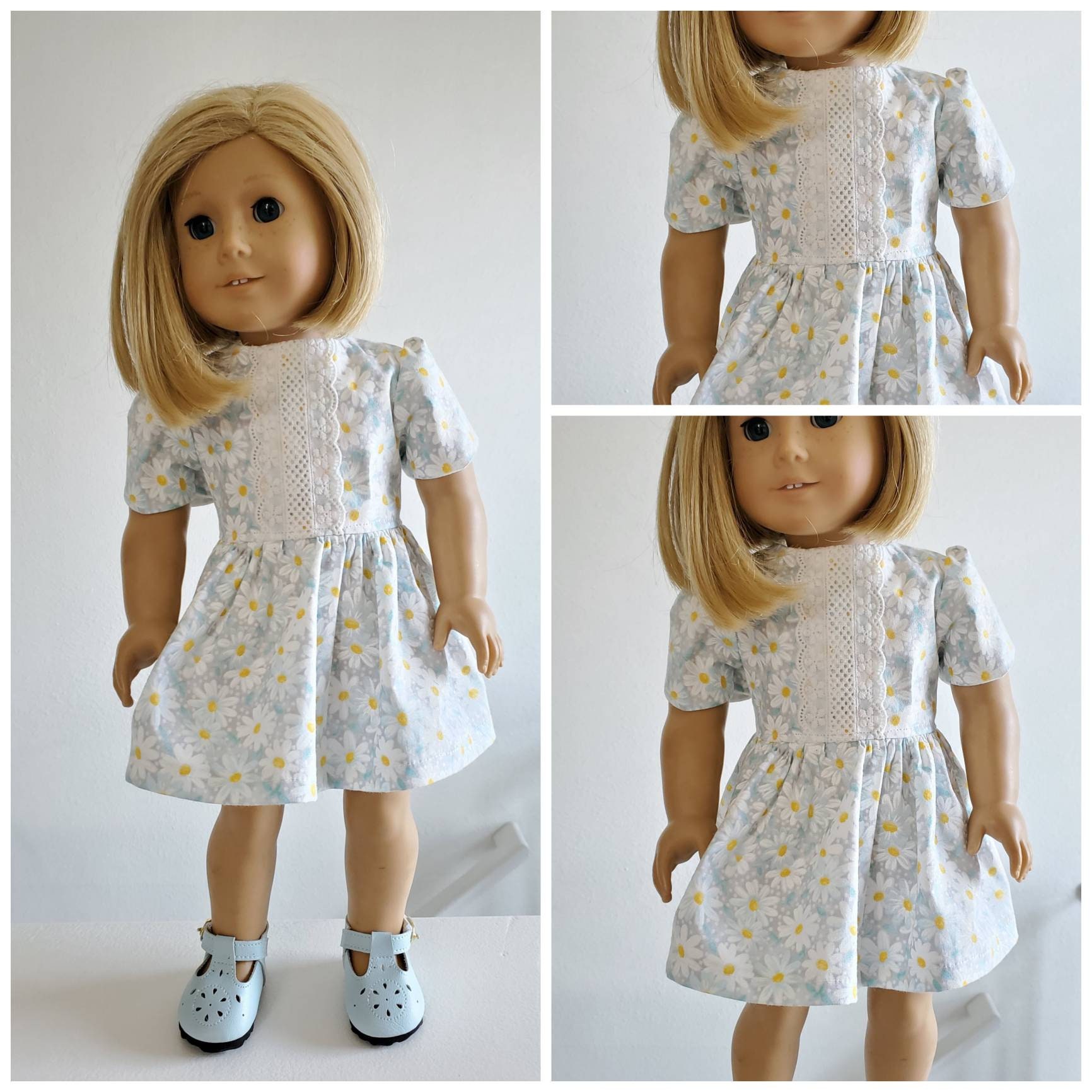 Fresh Spring fabric makes this dress so pretty. I put lace down the front of the bodice.. You choose the color purple or pink fabric below. All seams that would fray have been professionally finished .and the bodice is fully lined. The back has a Velcro closing. Although I made this outfit to fit cloth bodied 18” dolls such as AmericanGirlDoll. Doll and shoes not included. Smoke Free Home