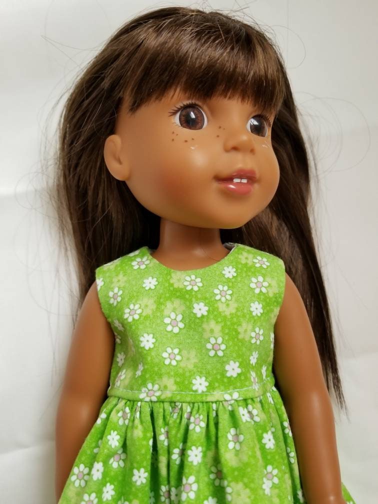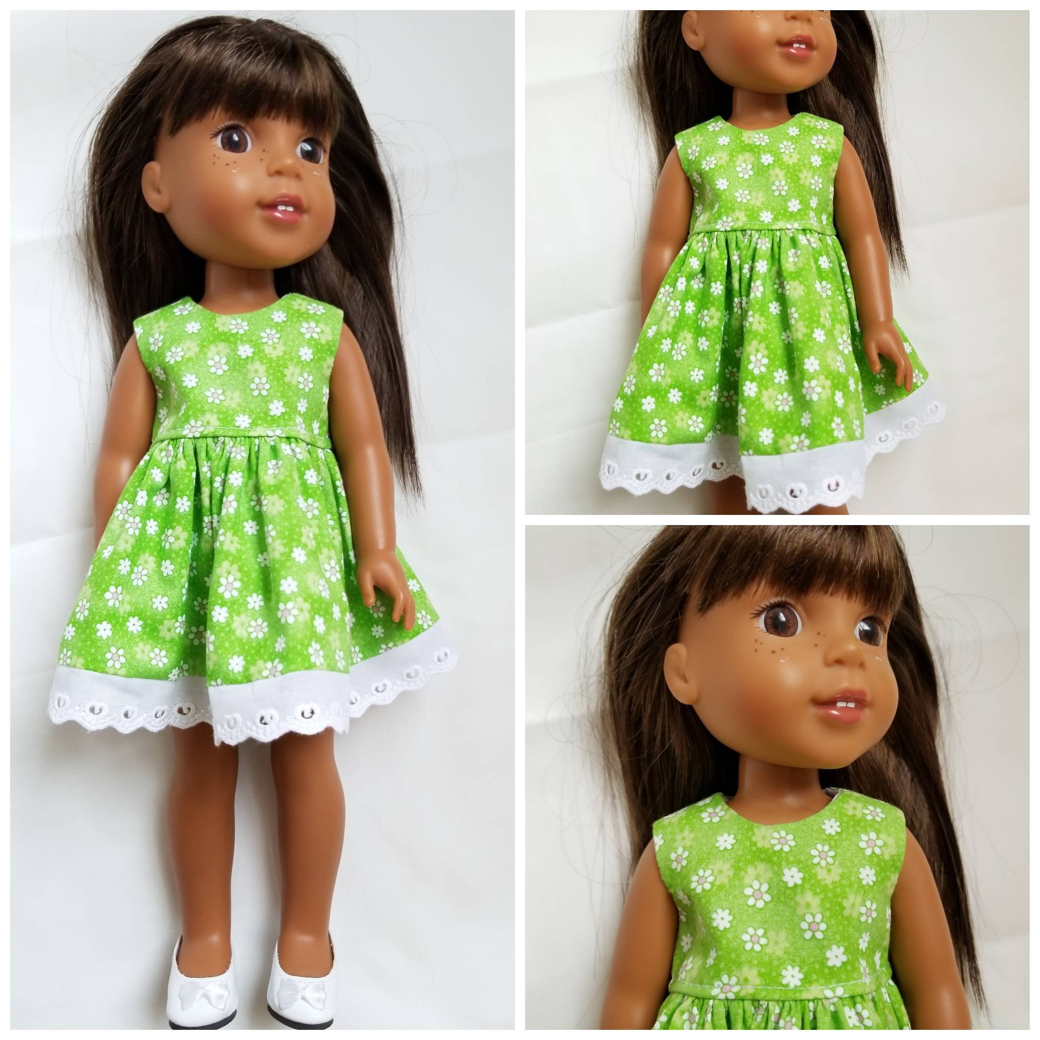 White daisy dress for your Wellie Wisher Doll. Eyelet lace at the hem. All seams have been finished and bodice is fully lined.
