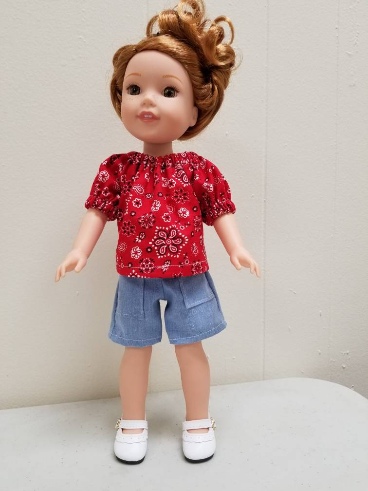 A red Peasant style blouse and blue shorts with elastic at the waist will fit your 14 inch Doll.