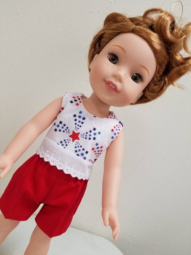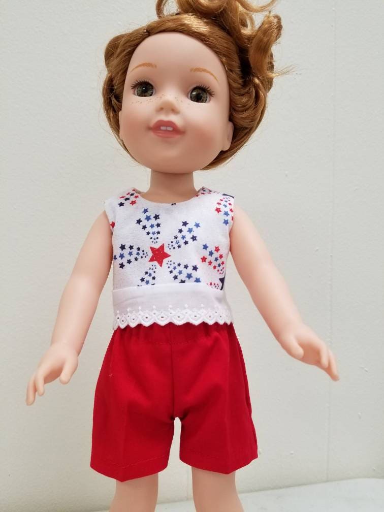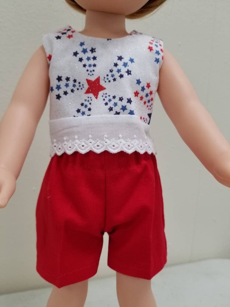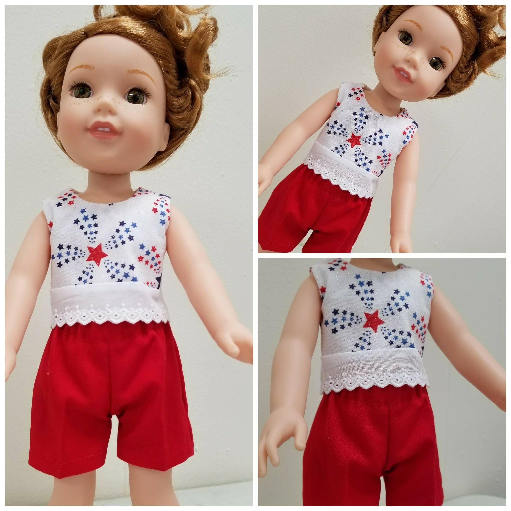 Cute patriotic crop top and shorts to fit your Wellie Wisher Doll. Top is fully lined with Velcro closing in the back and the shorts have an elastic waist.