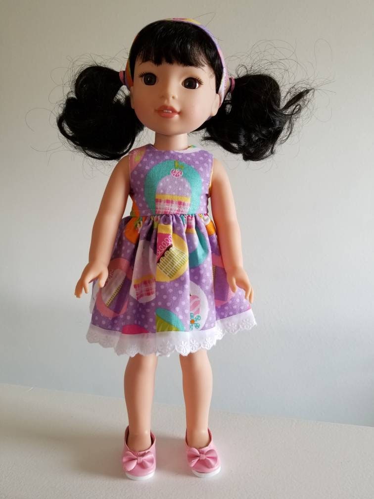 2 piece. Cupcake dress with headband. Wish Doll. I put white eyelet lace at the hem. All seams have been finished and bodice is fully lined.