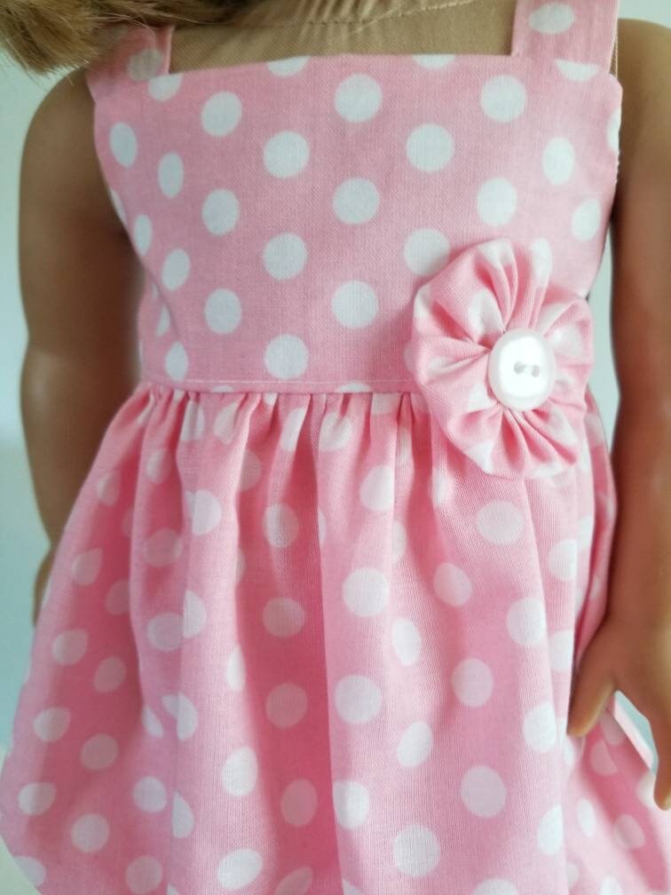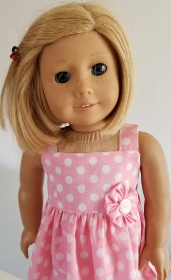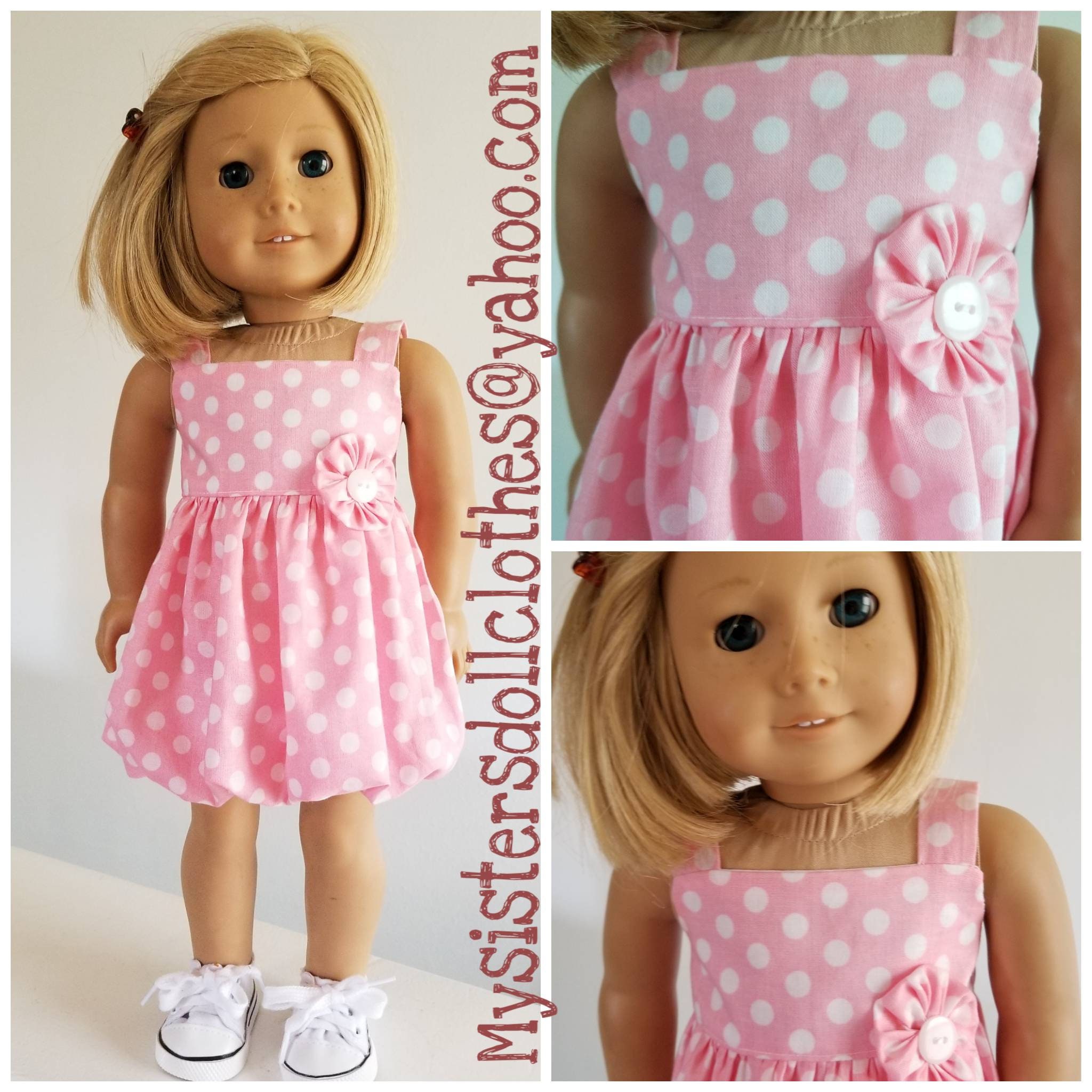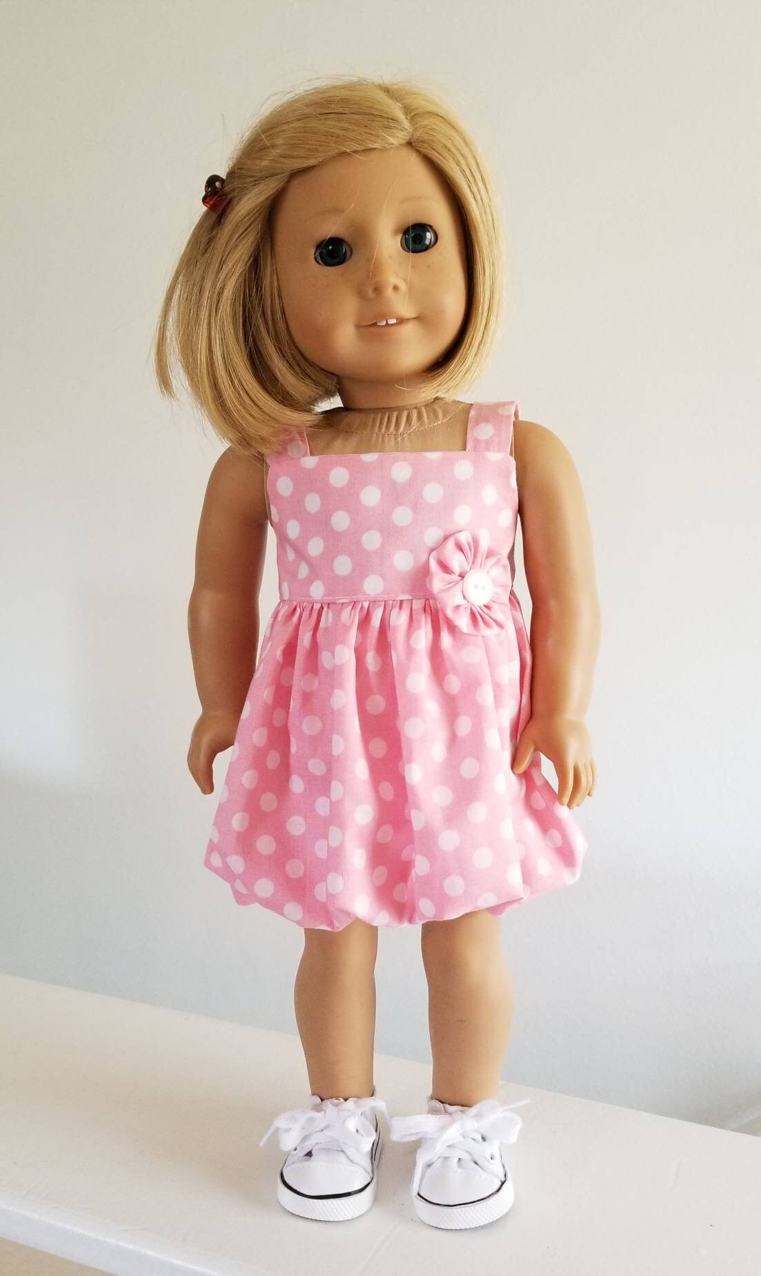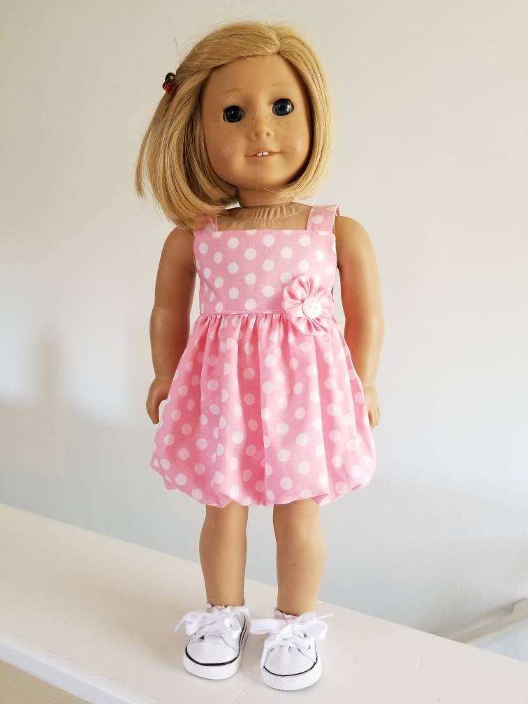 This dress has a bubble hem line. Fresh and clean pink polka dot. I added a yoyo with a button at the waist.All seams that would fray have been professionally finished and the bodice is fully lined. The back has a Velcro closing. Although I made this outfit to fit cloth bodied 18” dolls such as those sold by American Girl Doll. Shoes not included. Smoke Free Home