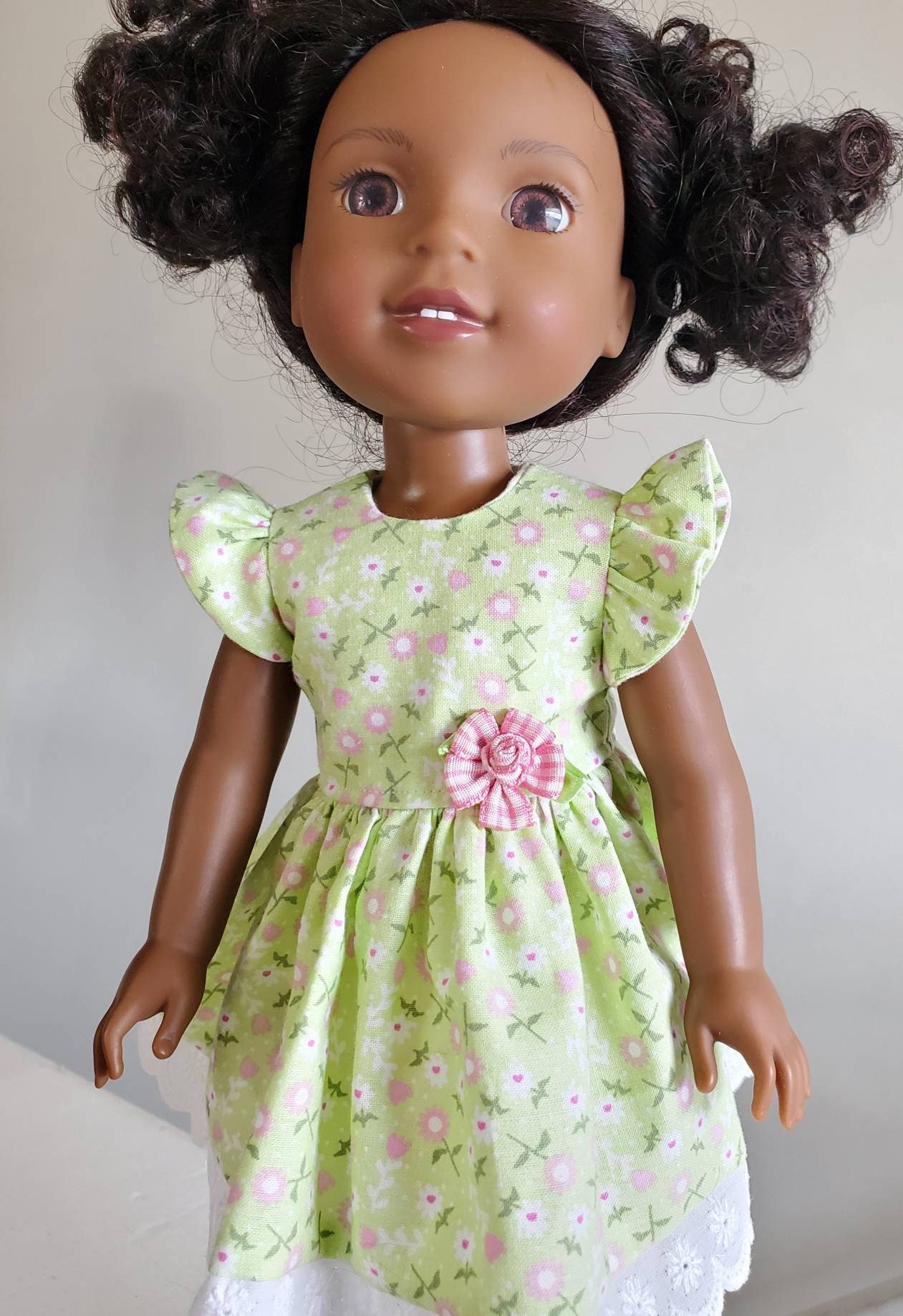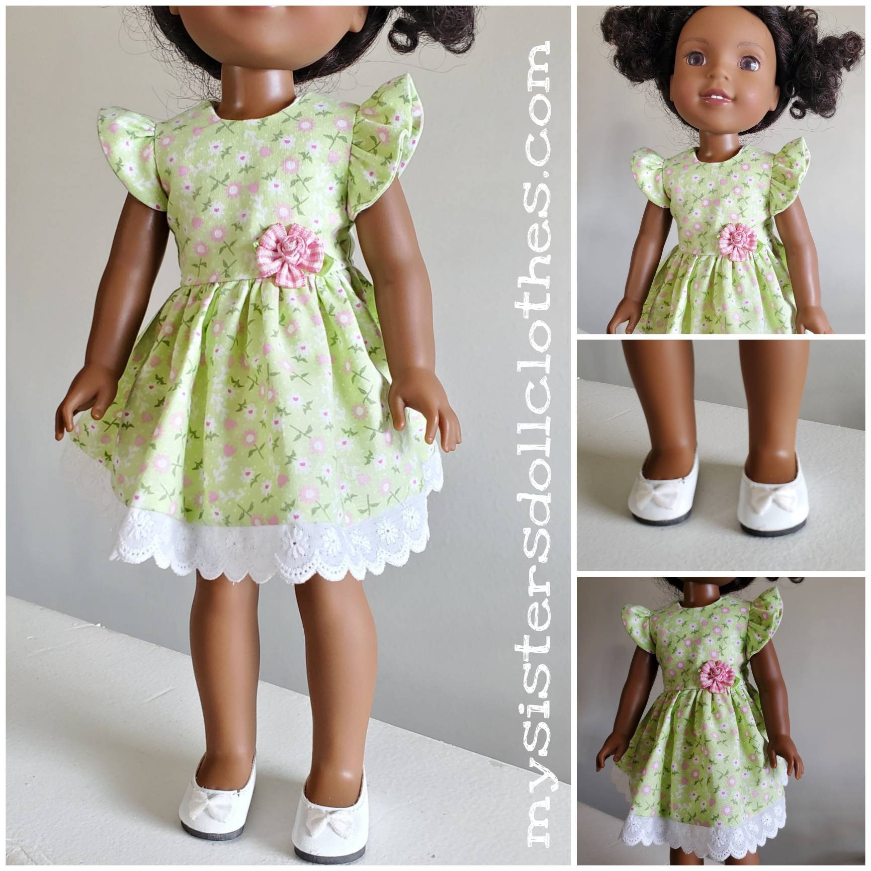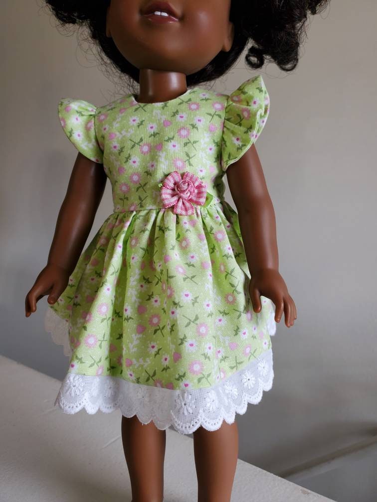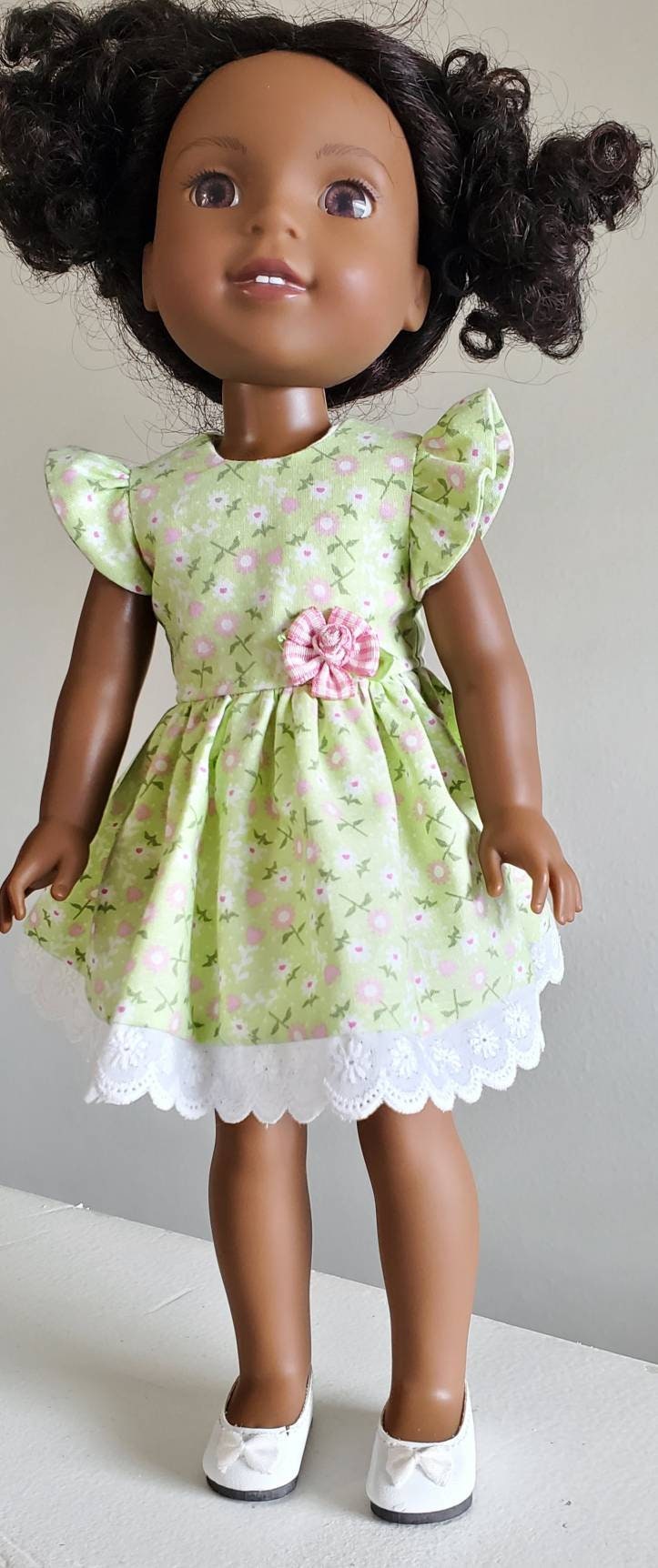 Flowers every where dress for your Wish Doll. This dress has fluttersleeves and a bow flower (may vary) at the waist. I put eyelet lace at the hem. All seams have been finished and bodice is fully lined.